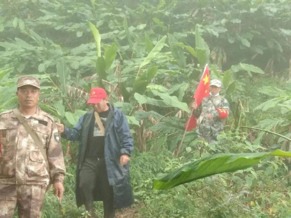 上午九点,大雨刚过,巡逻队伍淋着小雨,肩扛国旗,踩着泥泞的小道开始了新一轮的边境巡逻。巡逻队伍每天都会到各界碑进行巡逻且风雨无阻。