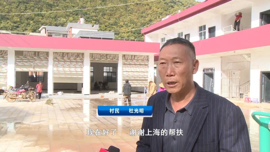 我们地方以前是污水淌得乱七八糟,现在得到上海的帮扶,把我们地方道路也修好了,小广场也建起来了修好,现在好了,谢谢上海的帮扶。