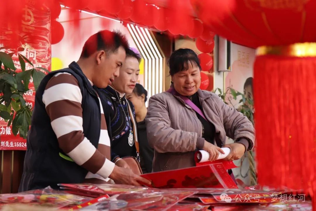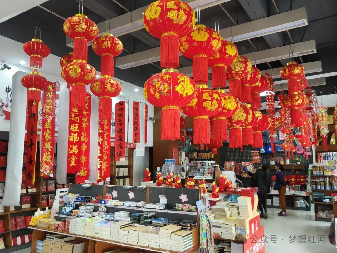 “吉祥春联门边挂,大红灯笼高空悬”。记者走进红河县年货街、书店、各大超市,浓浓的“年味”扑面而来,火红的中国结、各式各样的小灯笼悬挂在半空,一幅幅写满吉祥祝福的春联,各式各样的福字“红包”,龙元素挂饰等铺满了整个摊位,装扮得喜气洋洋,不少市民来回穿梭,精心挑选着各类春联、福字,处处洋溢着喜庆的气氛。