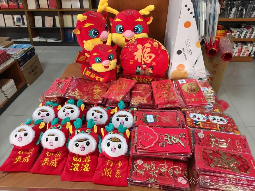 “今年我们为大家准备的年货有门神、对联,还有灯笼,品种很多,因为今年是龙年,所以龙的饰品是很多的,而且临近过年了,大家都在断断续续的买年货了,我们会根据销售的情况来备货,满足大家的需求量。”红河县新华书店销售员王发明说。