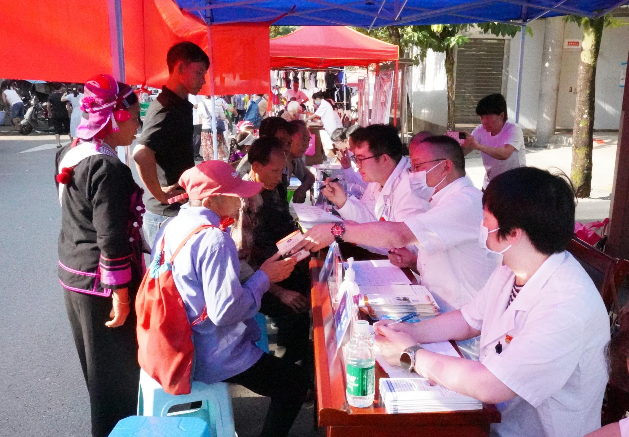 在金水河镇卫生院门口的义诊现场,村民早早前来等候。来自红河州第三人民医院的12名医疗专家迅速投入工作,耐心询问病史、细致查体,借助便携设备完成辅助检查,针对肿瘤防治等各类问题为村民逐一解答。