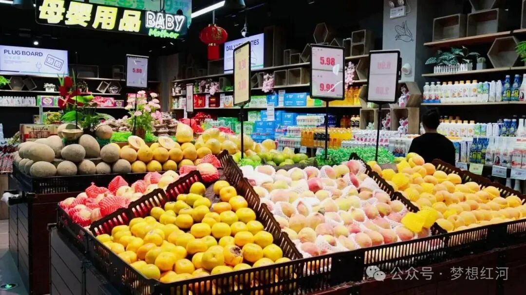 而在胡鲜生生活超市,蔬菜区、水果区、粮油区的货架都堆得满满当当,节日礼盒专区也摆放得整整齐齐。