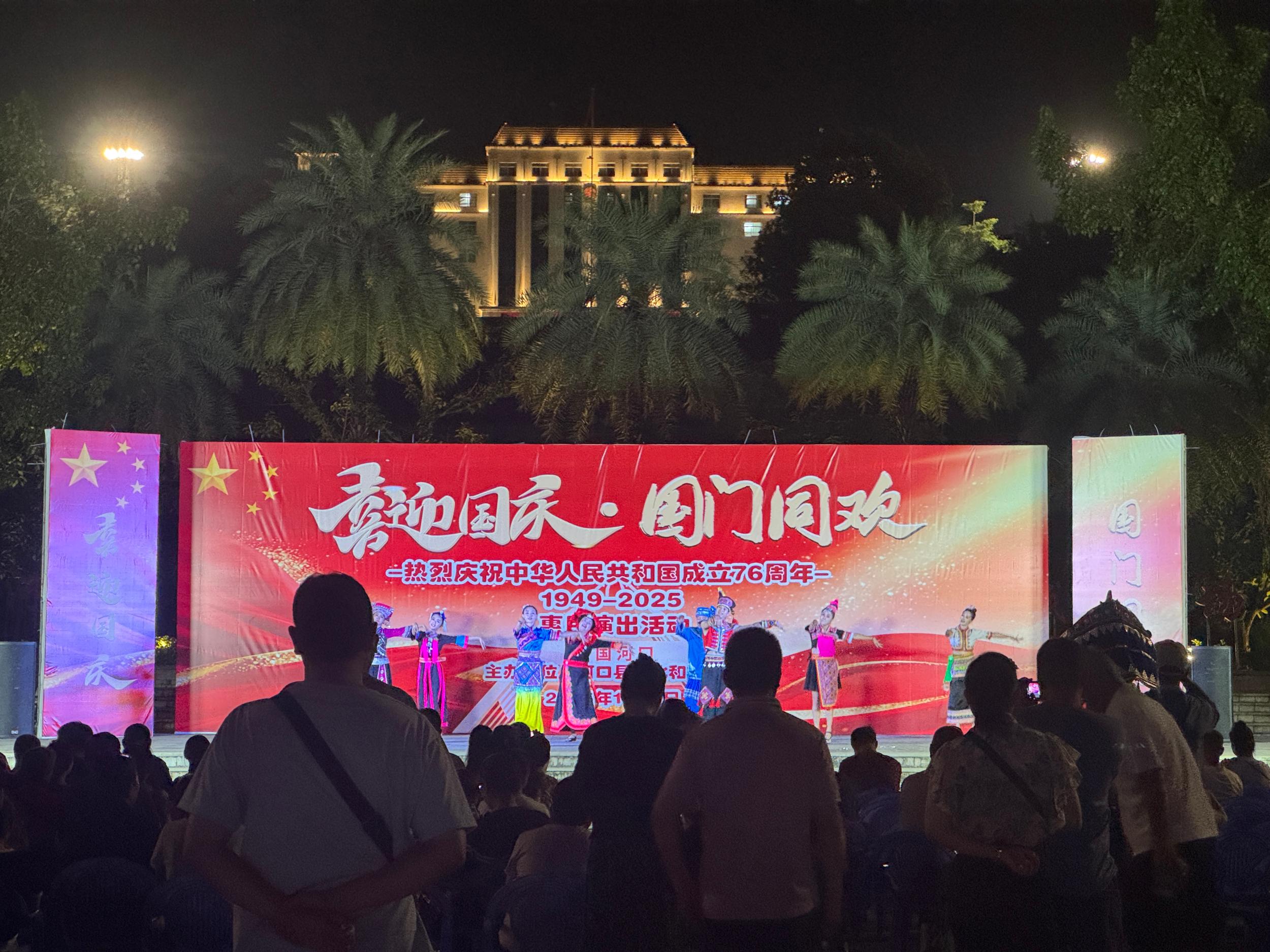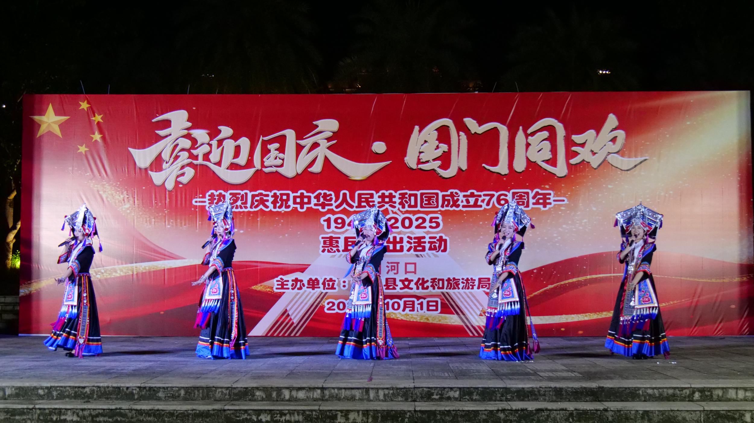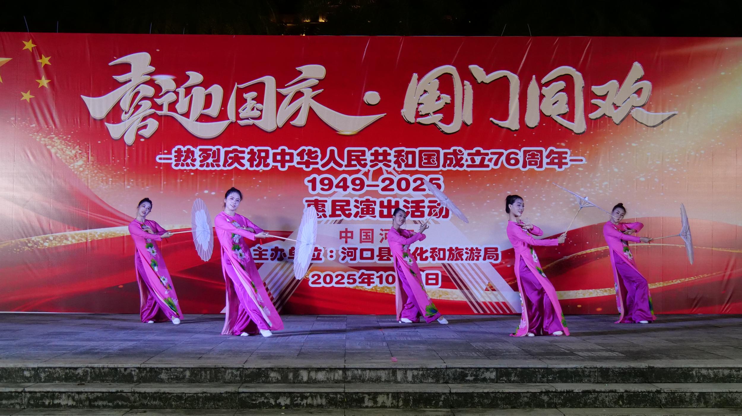 10月1日晚,红河哈尼族彝族自治州河口瑶族自治县“喜迎国庆 国门同欢”惠民文艺演出在北山民族广场精彩上演。边城文艺工作者以一场饱含民族风情与家国情怀的文艺盛宴,向祖国76岁生日献上深情祝福。