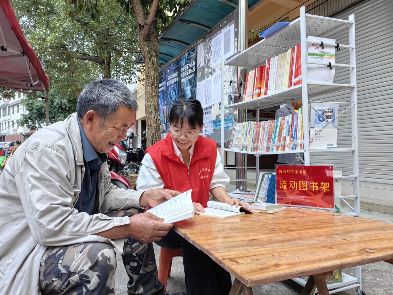 以往,和平镇的农家书屋大多藏在村委会的角落,村民想看书得专门跑路。为了让阅读“活”起来,镇上把“流动图书架”搬到者底冲、百福等村委会的核心赶集区。这些是老百姓每周最常去的地方,卖菜的、卖肉的、卖小吃的,吆喝声此起彼伏。书架刚摆好,就有村民凑过来。“这本《蔬菜病虫害防治》多少钱?”“不要钱,能借还能扫码看电子版!”志愿者笑着解释。