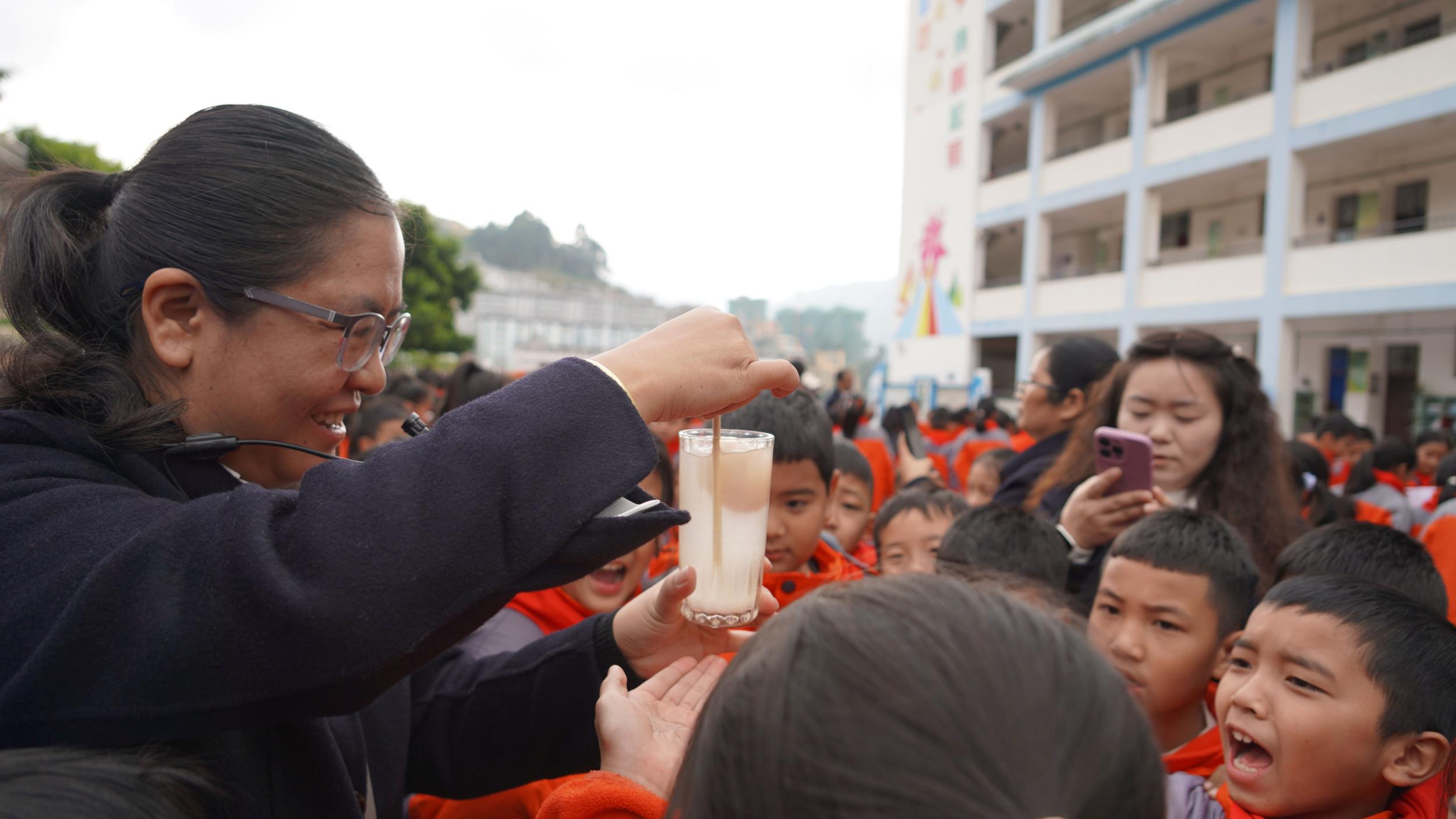 科学小实验展区堪称“人气打卡地”,每个班级的专属展台前都围满了好奇的孩子。“火山爆发”“站立牙签”“人工造雪”“柠檬破气球”等趣味实验轮番上演,老师与小讲解员耐心拆解实验原理,引导同学们动手尝试。重庆大学支教老师带来的“火焰掌”“仙境云雾”等特色实验更是将气氛推向高潮,让孩子们在欢声笑语中直观感受科学原理的应用魅力。