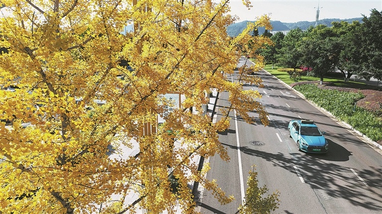 近日,弥勒市城区街道两旁的银杏树换上“金装”,与整洁的道路、现代化建筑相映成趣,呈现着四季不同的生态美景。图为弥勒市街景一隅。(普佳勇)
