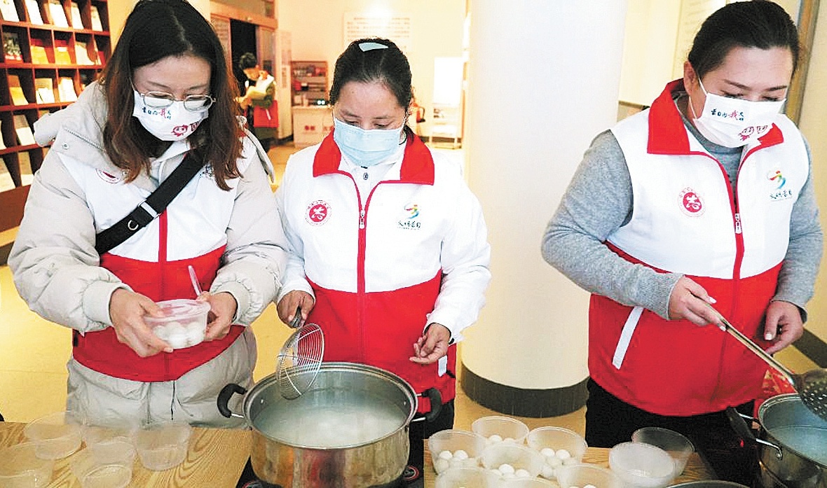 志愿者在煮汤圆。