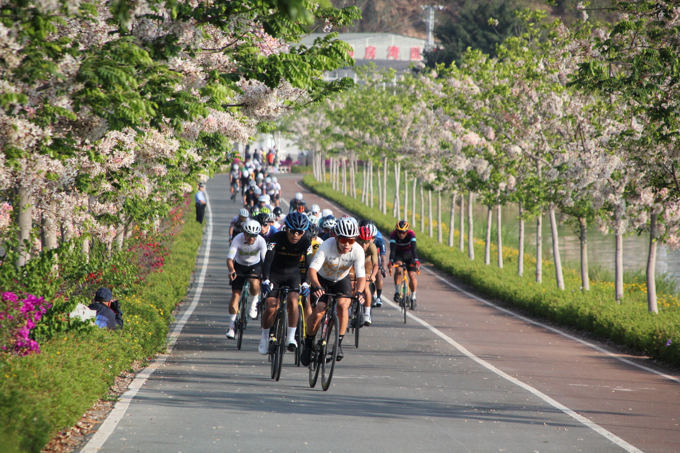 作为云南九大高原湖泊之一,异龙湖拥有97%湿地率的国家湿地公园生态基底,环湖廊道串联“湖—林—田—村”多元景观带,骑行途中可沉浸式体验三重景观维度——水域景观涵盖“三岛九曲七十二湾”的湖光涟漪,湿地景观可见白鹭、紫水鸡、黑翅长脚鹬等鸟类,目前已累计监测记录野生鸟类176种,含国家一级保护鸟类3种、二级保护鸟类20种;陆域景观随季节呈现木棉花、蓝花楹、荷花的次第绽放,其中南岸牛角咀的神黄豆花海与西岸的稻田碧浪构成特色田园画卷;廊道采用透水混凝土工艺打造红蓝双色赛道,既保障骑行安全,又实现雨水自然渗透,与湖滨生态系统和谐共生。