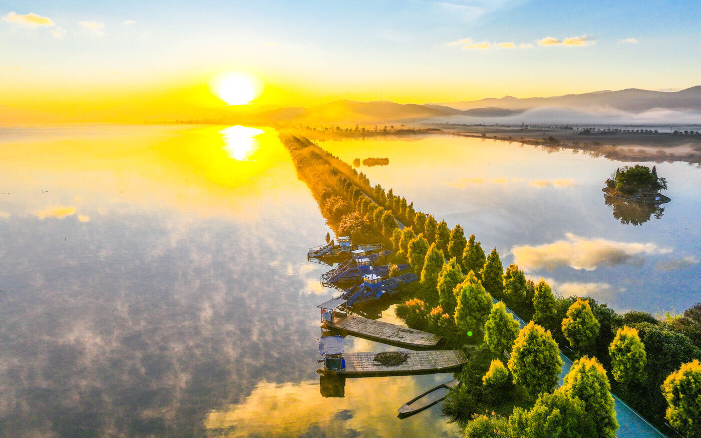 值得一提的是,异龙湖骑行赛道线路深度融合了“文献名邦”石屏县的深厚历史文脉与多彩民族风情,途经临水而建的广胤寺,可品茗观湖感受“清泉古刹”的禅意静谧。龙港村的青瓦白墙古民居与百年米轨铁路印记,留存滇南商帮的历史记忆,沿途花腰傣族的传统民居与海菜腔非遗展演为骑行注入浓郁民族特色。坝心码头的日落景观更是人文与自然的完美交融,霞光映湖的光影盛宴被誉为“治愈系摄影天堂”。