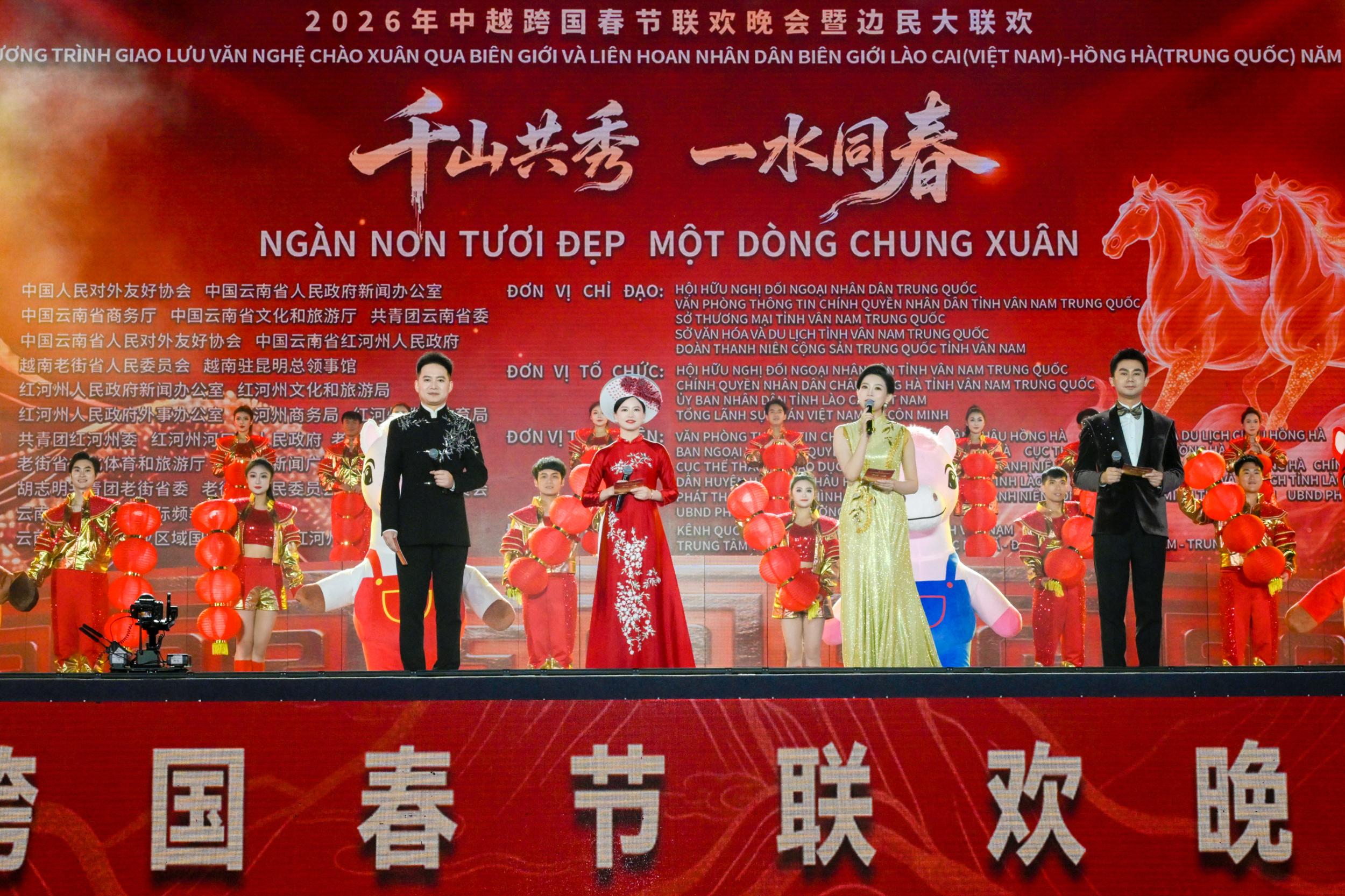 本次活动以“同心筑厚谊 携手共发展”为主题,分别在越南老街省老街坊、甘塘坊和云南省红河州河口县举行双方党政会晤和新春互访、礼节性会见,中越媒体合作交流会,中越青年友好交流暨青年企业家经贸合作交流会,中越青年羽毛球友谊赛等活动。作为系列活动的重头戏,2026年中越跨国春节联欢晚会暨边民大联欢晚会上,中越艺术家联袂登台、倾情演绎《西北春日》《友谊之河》《咋个还不来》《越南—中华》等节目,展现两国文化魅力与人民群众幸福生活,赢得观众阵阵掌声。