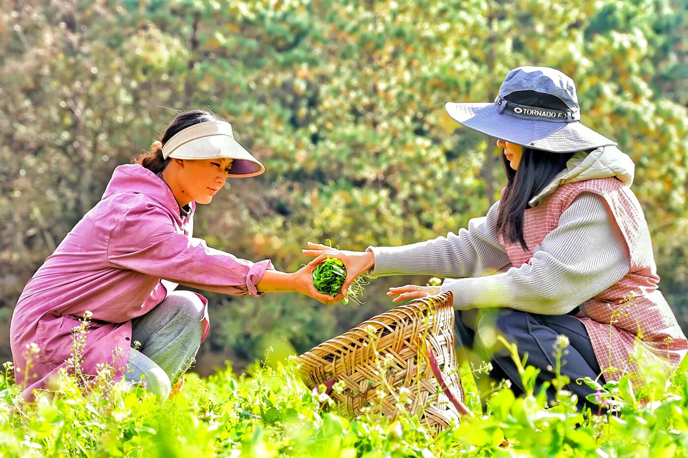 与莲藕的“慢生长”不同,豌豆尖、菜心等速生蔬菜正以“日新日鲜”的节奏上市。在西一镇大云村,连片的豌豆苗郁郁葱葱,农户们背着竹筐穿梭田间,熟练地掐下嫩绿的豆尖。“往年经济作物收完地就闲着,今年试种10亩豌豆尖,第一次采摘就有昆明老板来地头收购。”种植户毕家芬笑着算账,“每公斤7元,一个多月采收期能有3万元的收入。”