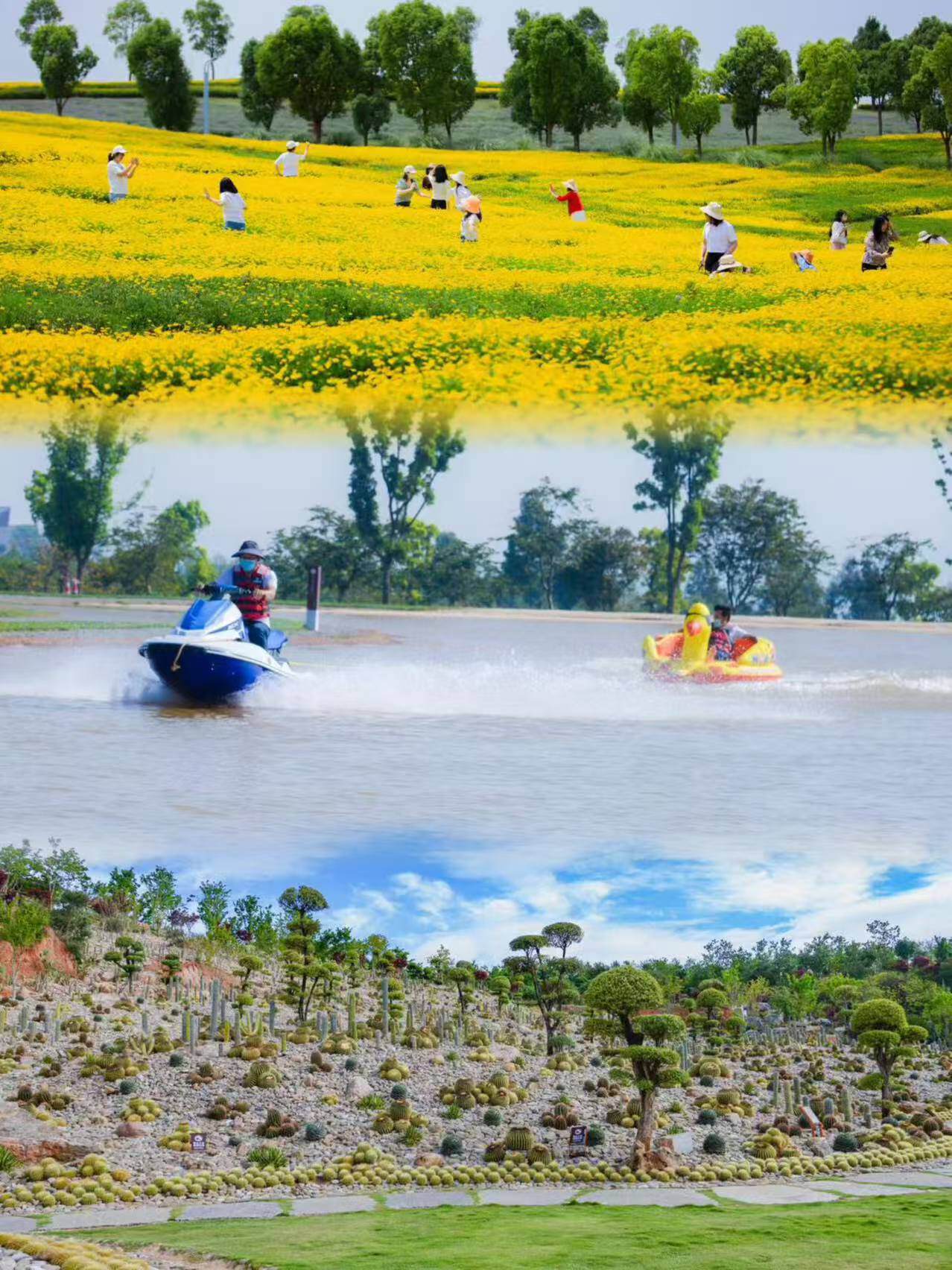 仙人掌群的异域光影、小火车的花海穿行、在三角梅迷宫里来一场爱丽丝梦游、看大鹅追着面包跑的滑稽可爱……
