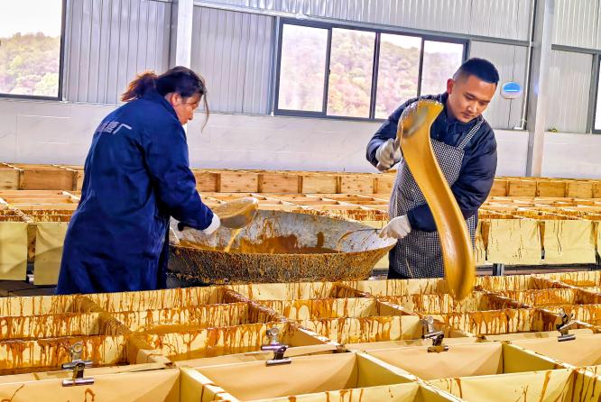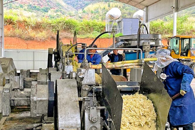 在村头的弥勒盛峰糖厂,刚运抵的甘蔗通过传送带进入加工车间。经过清洗、压榨、过滤、沉降、蒸发浓缩等12道工序后,琥珀色的糖浆在熬糖匠人的搅拌下渐渐凝结晶化,最终形成色泽温润、甜而不腻的优质红糖。