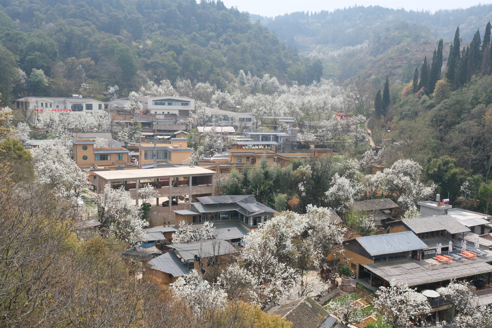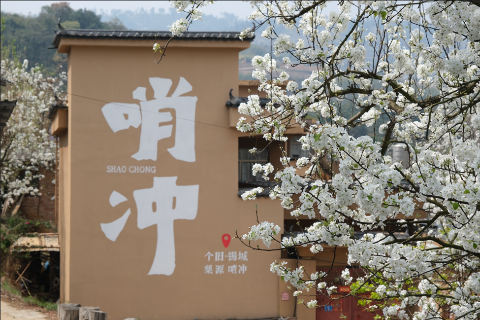 从云南省个旧市区驱车向南,不过二十分钟,便驶入另一重天地。蜿蜒的山路将城市的喧嚣过滤,待到看见满树梨花时,梨源哨冲就到了。