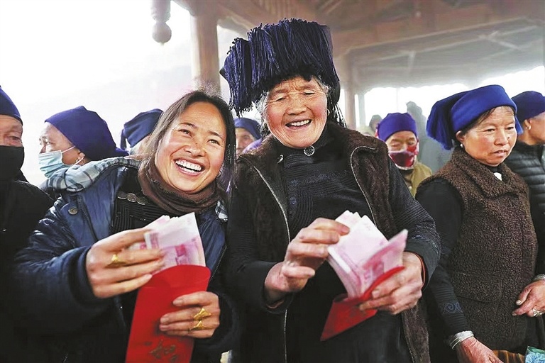 近日,元阳县新街镇爱春村委会阿者科村举行“阿者科计划”第十三次分红大会。全村65户村民共领取分红55.4万元,户均分红8523元。自2018年实施“阿者科计划”以来,该村累计分红400.66万元,户均累计增收61640元。