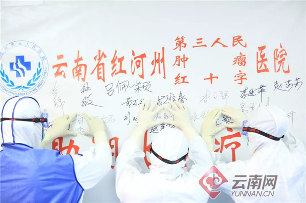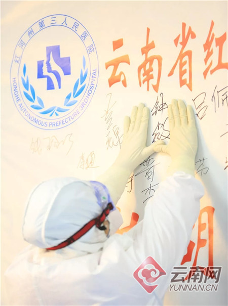 战“疫”一线医生在签名墙前