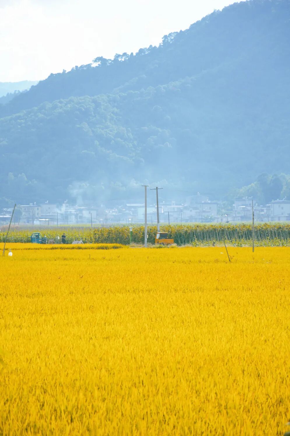 田边有农人正在劳作,他们弯腰查看稻穗的长势,偶尔直起身来歇歇。夕阳把他们的影子拉得很长,落在金黄的稻浪里。