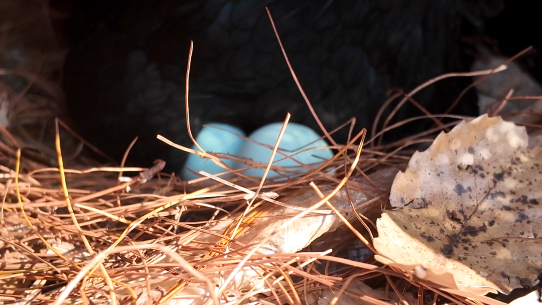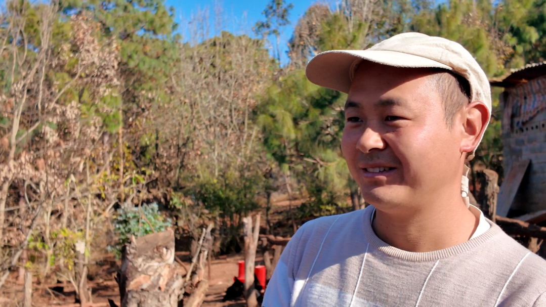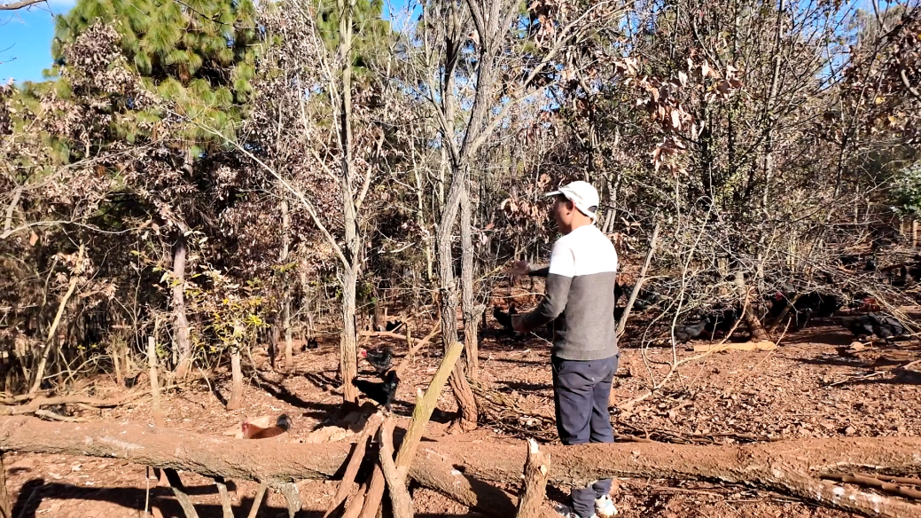 【箐脚村民 何竞春】我觉得我们当地林业资源比较好,就想来发展林下养殖,通过考察后养了现在的这个品种,它是药膳滋补的一个品种,产的是绿壳鸡蛋。