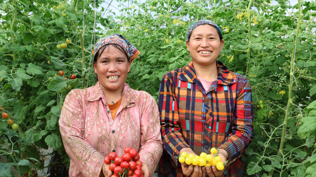 走进大棚,满眼翠绿的藤蔓间,一串串红、黄两色的小番茄缀满枝头。果实小巧玲珑、圆润饱满、果面油亮,在阳光下泛着诱人光泽。